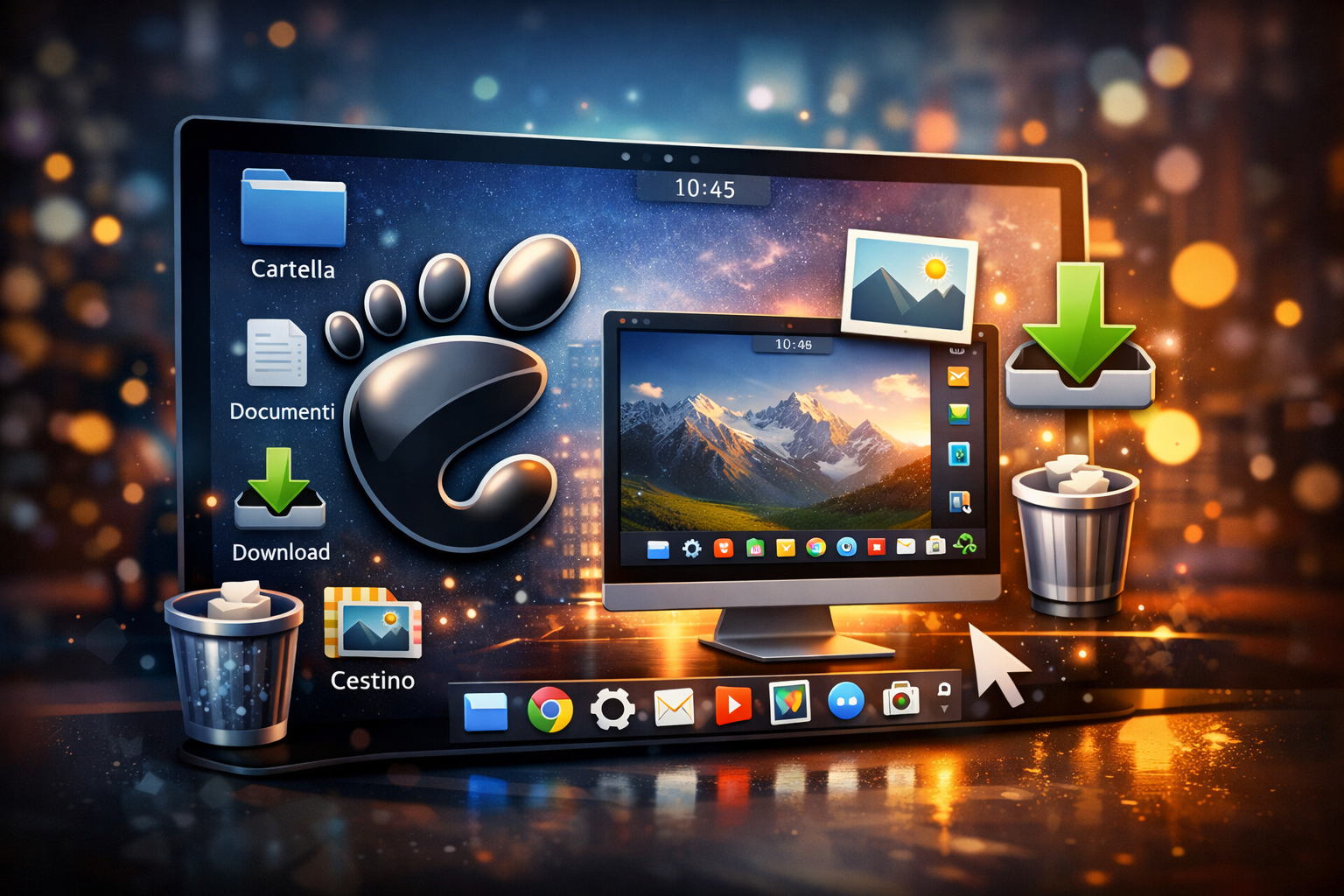 Il modo più efficacie per riportare le icone sul desktop è quello di installare Nemo, il file manager di Cinnamon, fork di Nautilus, per fargli gestire solo le icone del desktop [²]. Quindi a seconda della distro, avremo